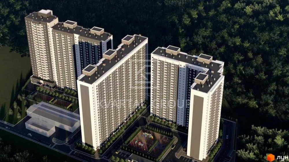 На території ЖК: квітники, зелень, лавки, спортивні й дитячі майданчики.