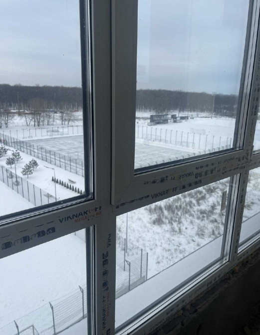 Гарний краєвид із вікна на ліс і дитячий стадіон.