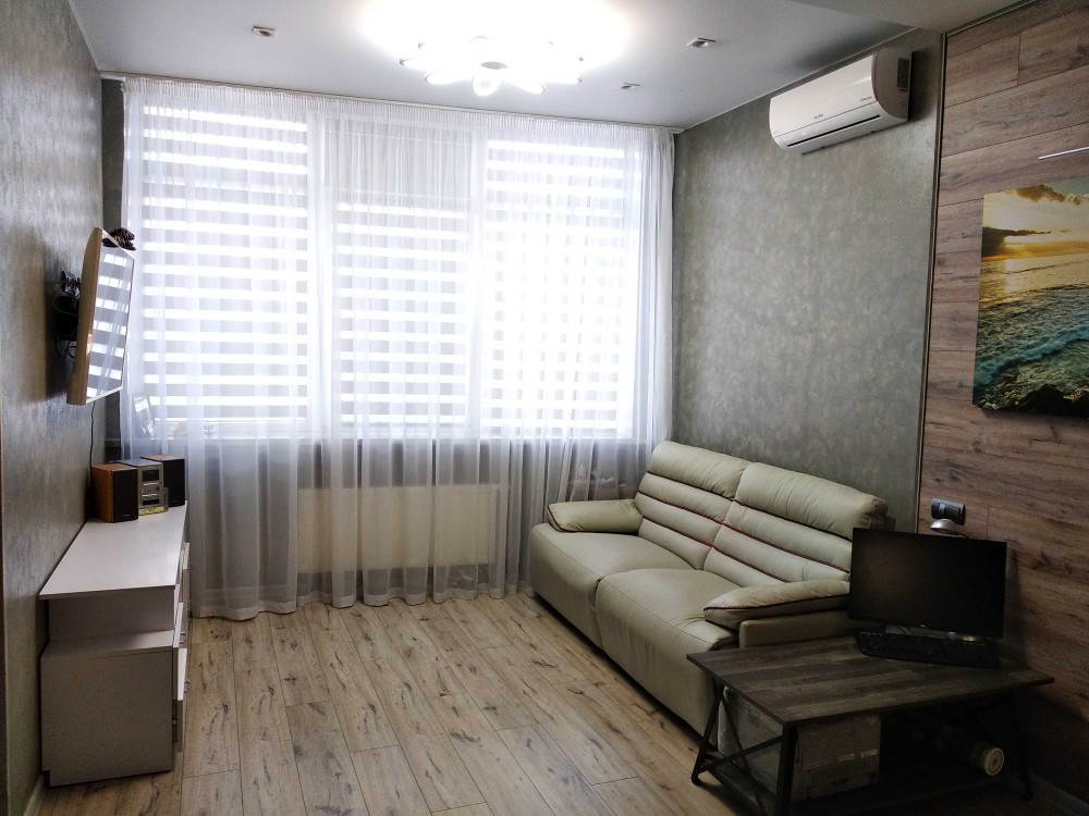 Квартира знаходиться на 3-му поверсі 26-поверхового будинку. Загальна площа 46 кв.м, житлова 20кв.м, функціональна велика кухня-студія 14 кв.м, просторий коридор! Стелі 3 метри! Велика містка гардеробна з полицями, вішалками! Санвузол функціональний з великою душовою кабіною, двері і стійка душкабіни з товстого скла, робилася на замовлення! Квартира продається з новим ремонтом, меблями і необхідною технікою. У квартирі зроблений інтер'єрний дизайнерський ремонт у світлих тонах у поєднанні декількох стилів: «Style Classic» і «Style High-tech»! Квартира дуже світла завдяки великим вікна, сонячне світло присутнє завжди, пряме сонце в другій половині дня після обіду, влітку не жарко, але, на найспекотніші дні встановлений відмінний кондиціонер! По всій квартирі прокладена «Тепла підлога» включаючи ванну кімнату!