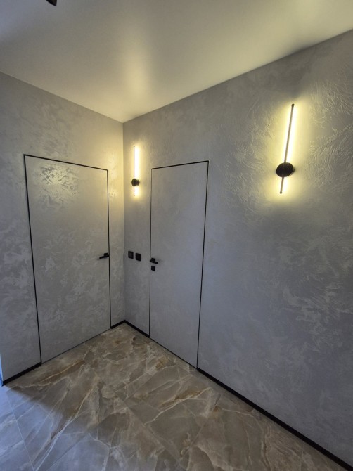 Декоративна штукатурка та двері прихованого монтажу додають стильного шарму