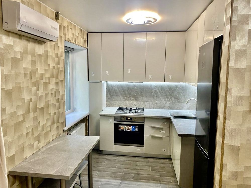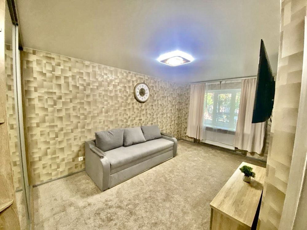 Квартира на 1 поверсі в 5 поверховому цегляному будинку, у середині будинку. Площа 34м, кухня- їдальня. Зроблений новий євроремонт: стяжка підлоги, стіни збивалися до цегли штукатурились потім гіпсокартон та шпалери, нова мідна проводка, автомати, поміняні труби та стояки, встановлені лічильники на газ та воду. Пластикові вікна, батареї. Нова техніка та меблі, усе ще в плівці