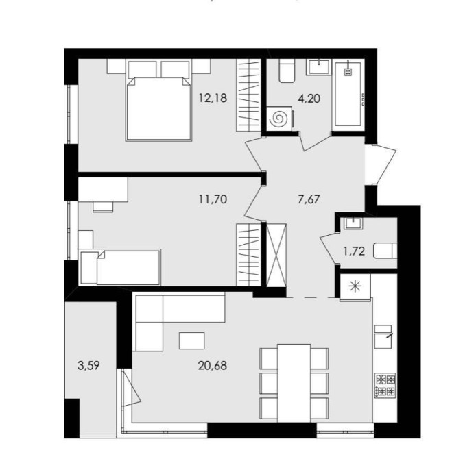 Площа 61,74 м2, кухня - вітальня 20,68 м2