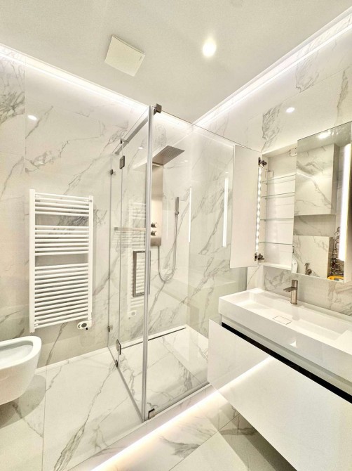 У квартирі все наповнення від провідних світових брендів. Шумоізоляція та утеплення стін, паркет, електрика, кондиціювання.