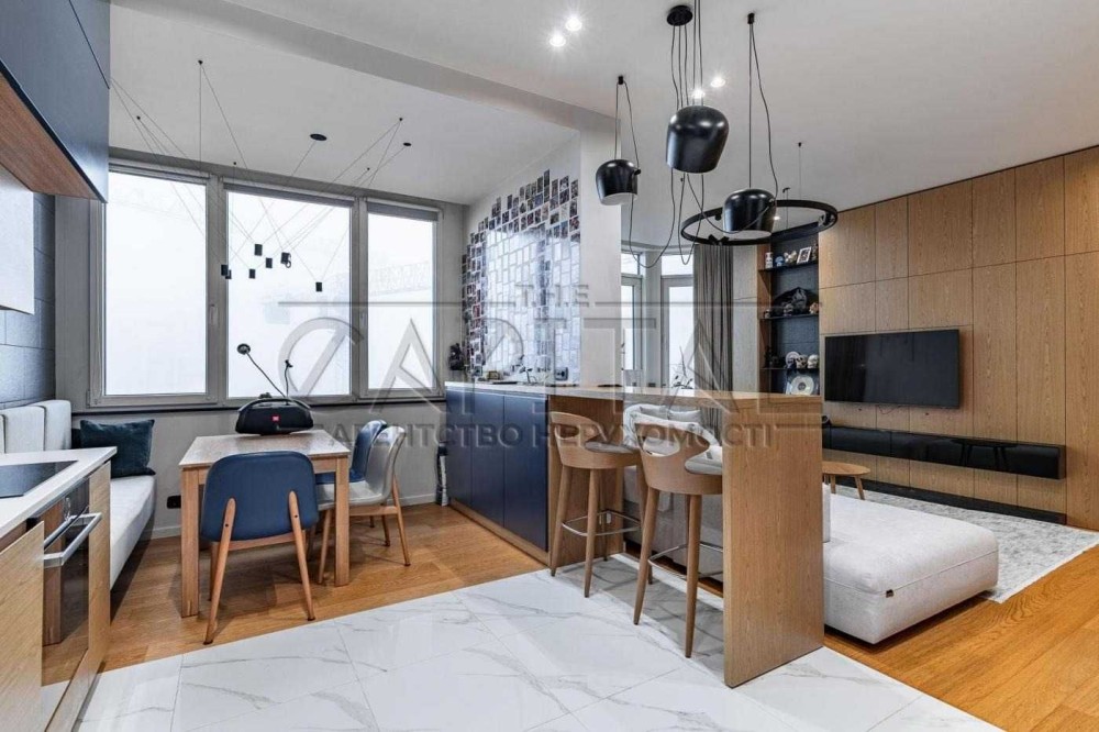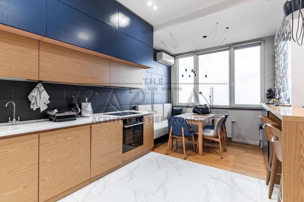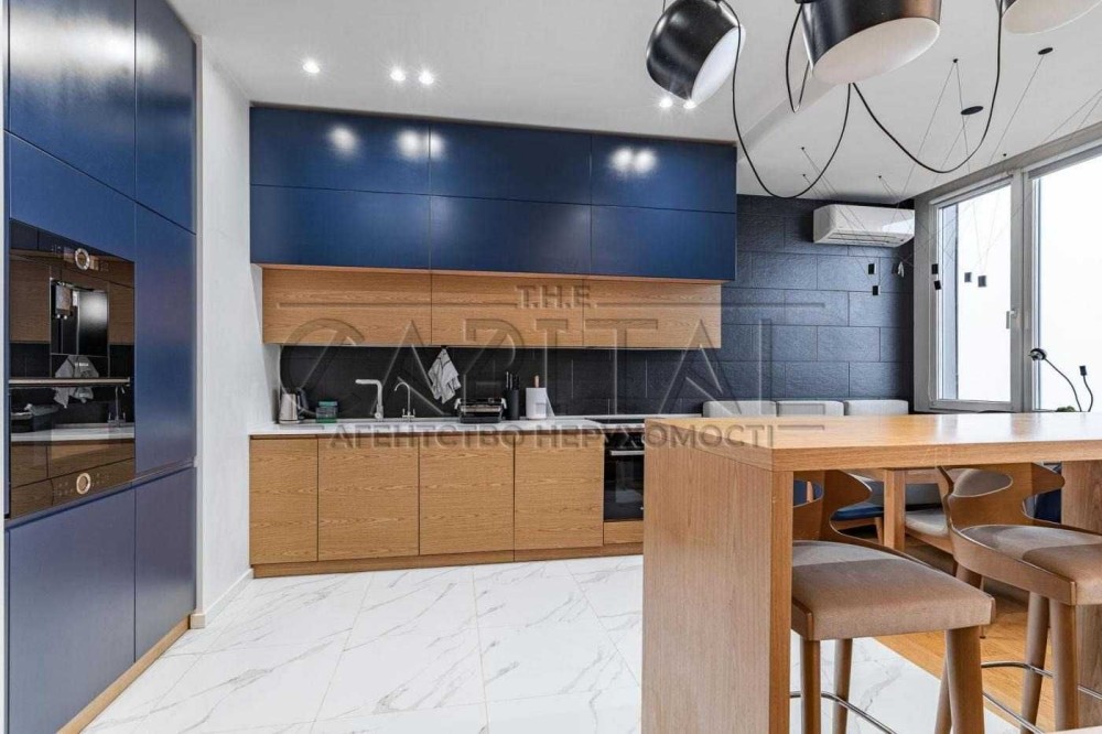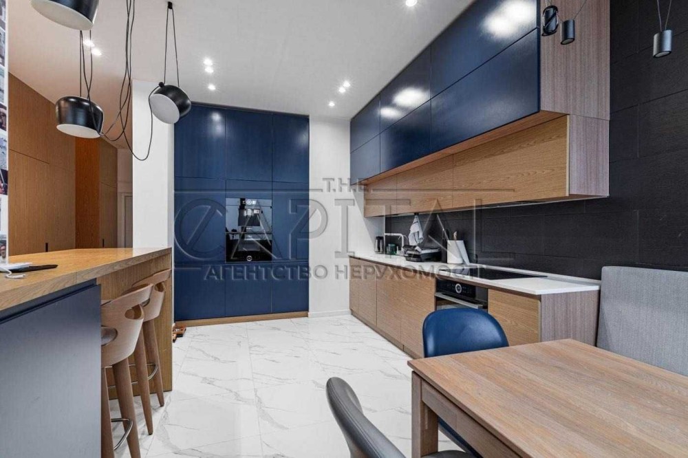 Кухня: Сучасний дизайн із використанням меблів преміум-класу та техніки. Елегантність додають дерев’яні фасади та стильні темно-сині акценти.