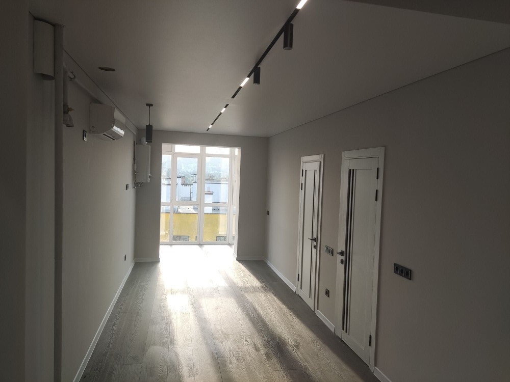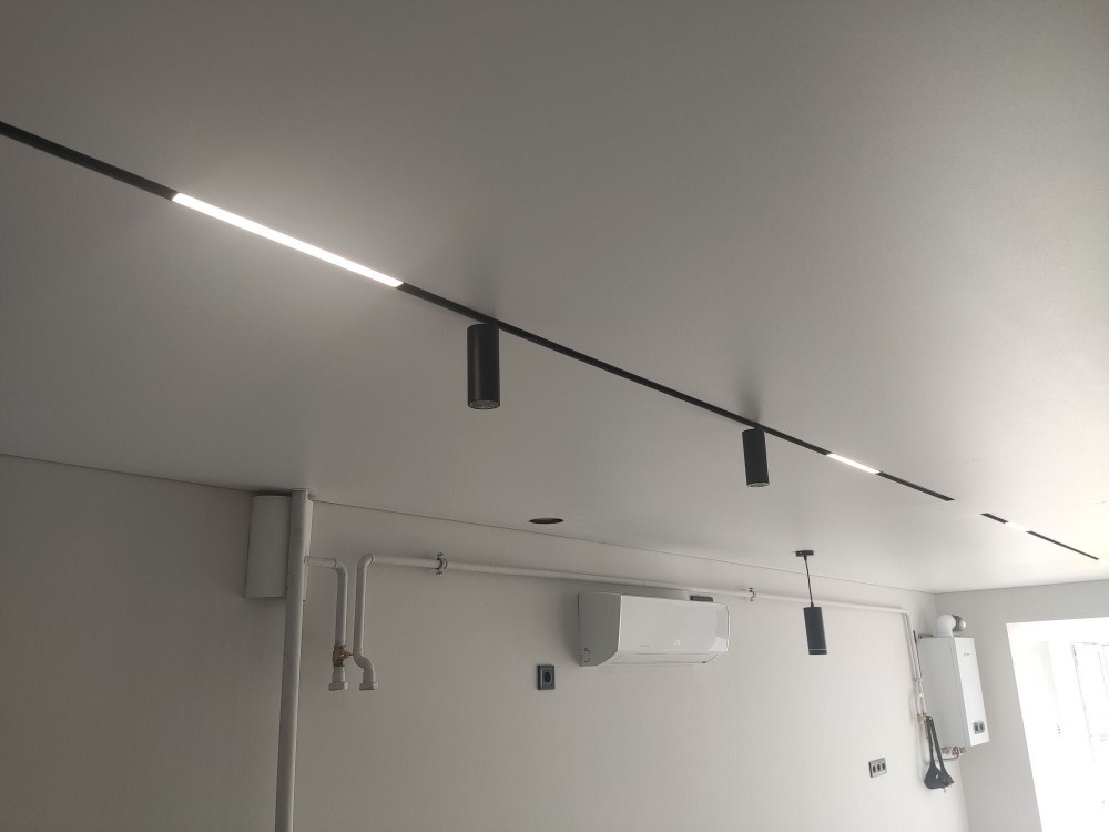 Стеля натяжна "MSD- premium" від фірми" Velum " ,профіль тіньового монтажу . В кухні - студії на освітлення ,в натяжній, вбудавана магнітна трекова система .