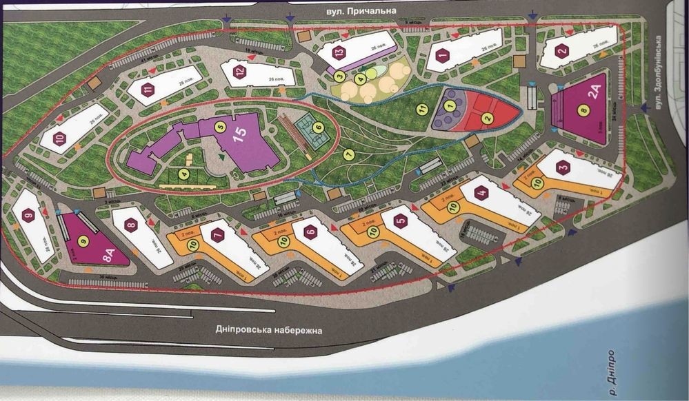 На території комплексу дитячі та спортивні майданчики, прогулянкові алеї, магазини, кафе, ресторани, аптеки, салони краси, наземний та підземний паркінг, дитячий садок.