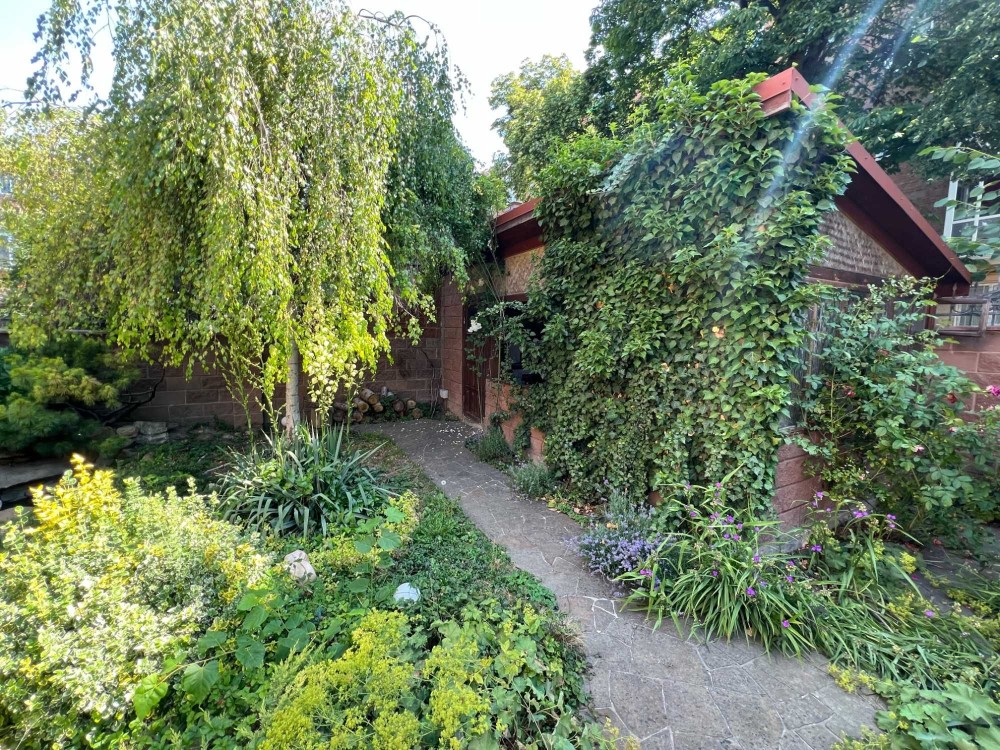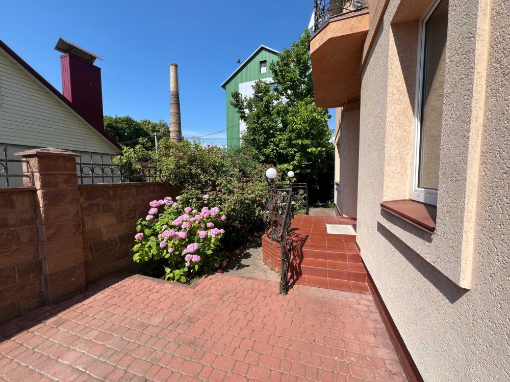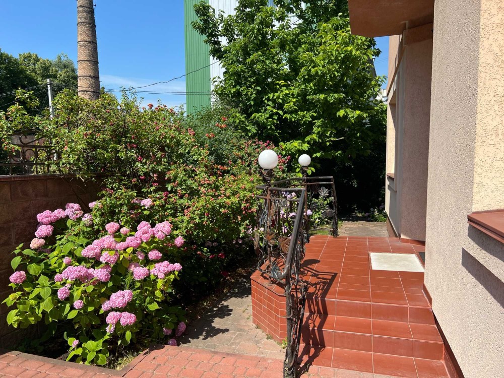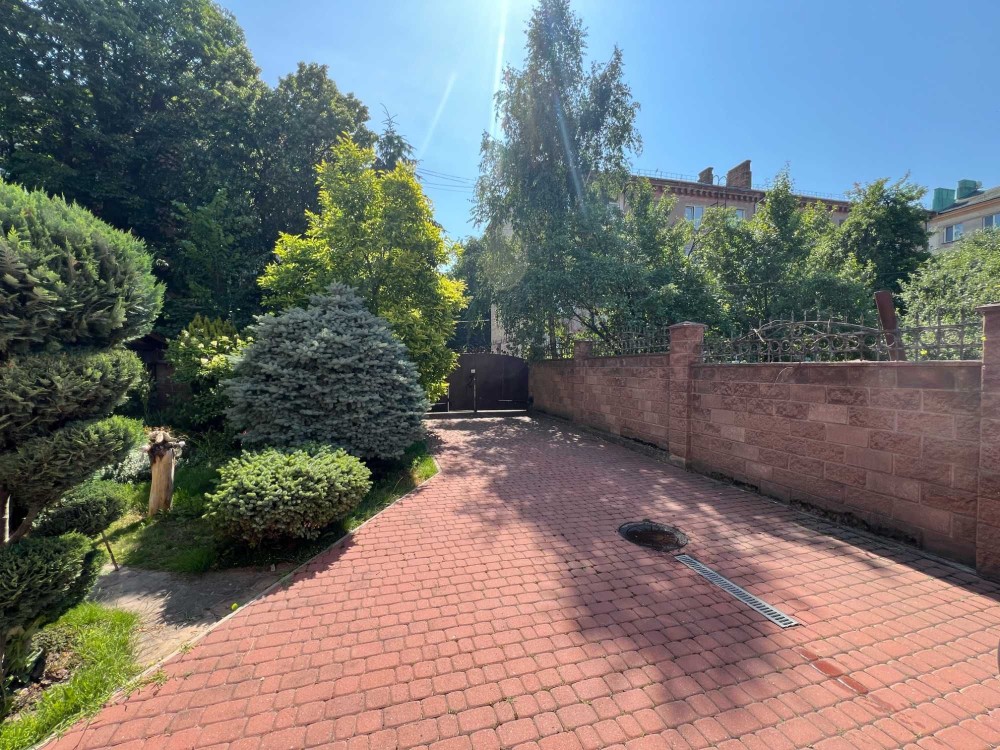 Територія огороджена парканом, встановлена кована брама на вїзд. Доріжки подвір'я замощено бруківкою з системою водовідведення. Ландшафтний дизайн подвір'я наповнюють рідкісні дерева, кущі та квіти.