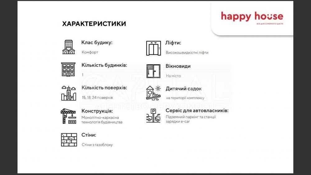 Житловий комплекс Happy House спроектований для тих, хто цінує комфорт, безпеку та сімейні цінності. У комплексі продумана інфраструктура для розвитку та розваги дітей: свій дитячий садок, центр дитячого розвитку, сімейне кафе та клуб для мам "Мама Hub".