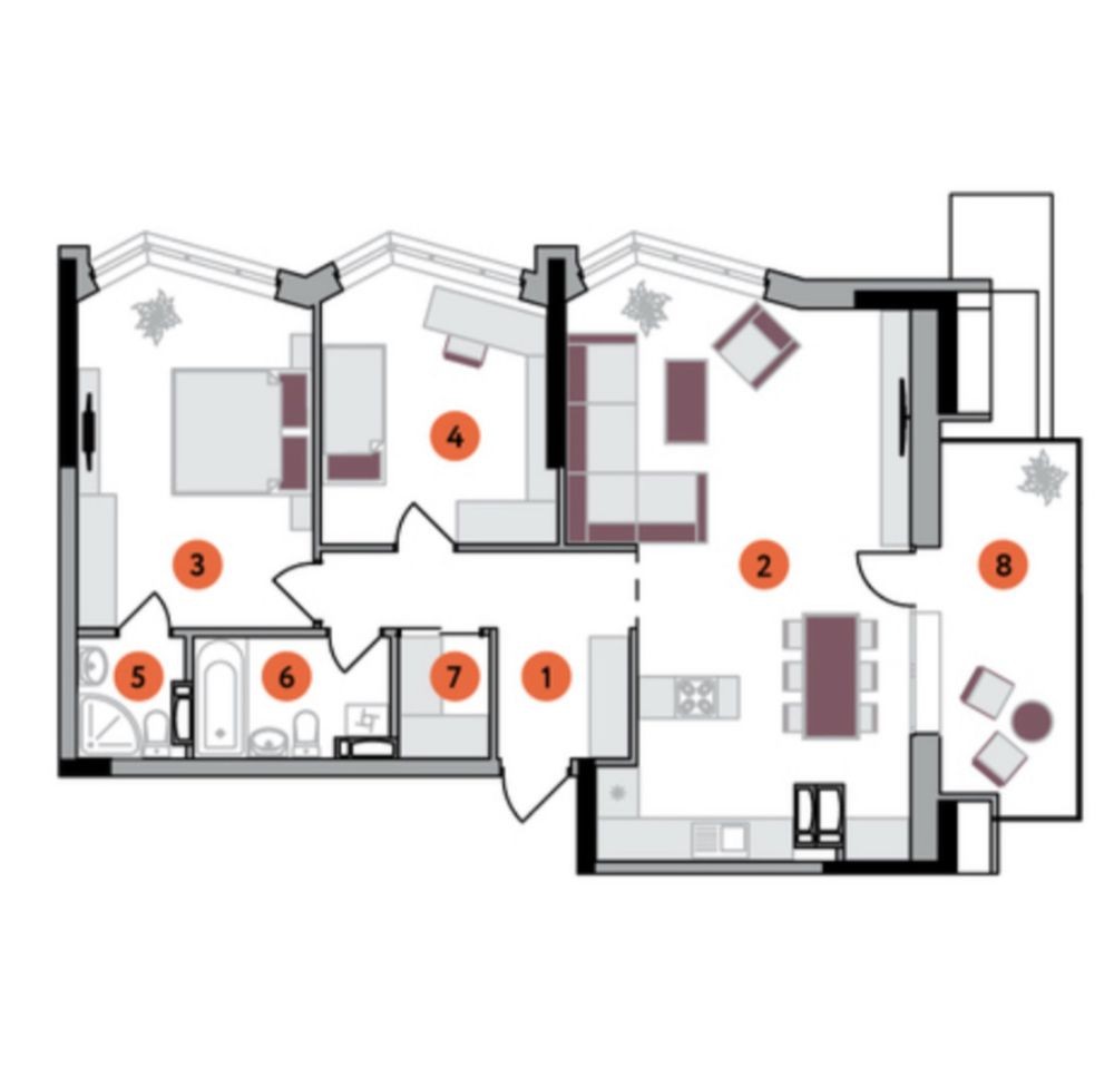 Планування 2Б2 площею 86,5 м² — це простора кухня-вітальня з прямим виходом на терасу, максимум світла й відчуття простору. Формат ідеально підходить як для сім’ї, так і для тих, хто цінує стиль та функціональність.
