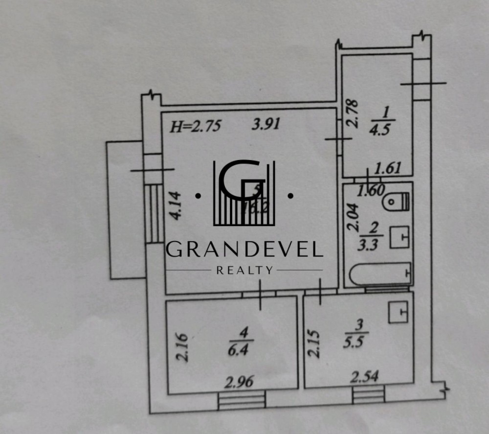 Загальна площа — 37 м², вітальня 16,2м² , кімната 6,4м², кухня 5,5м².