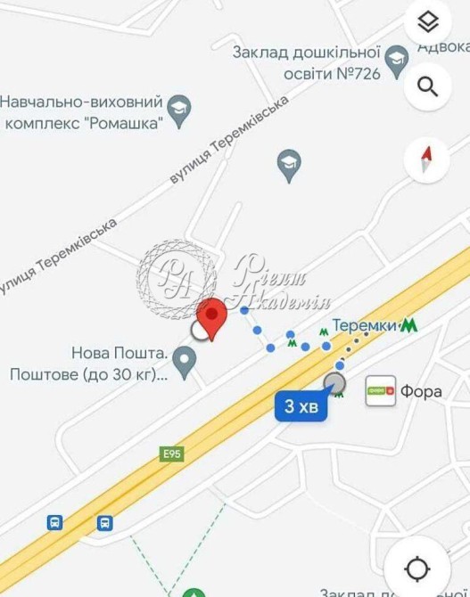 Інфраструктура: 2 хв. пішки до метро Теремки До супермаркету "Велика Кишеня" 450 метрів; "Фора" - 500 м. Нова Пошта - майже у дворі. До ТРЦ "Республіка" - 15 хв пішки / 5 хв. на авто (1, 3 км) У сусідніх дворах школа, дитсадок