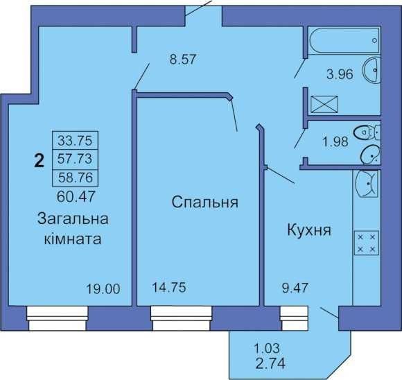 • Загальна площа 59.5 м2