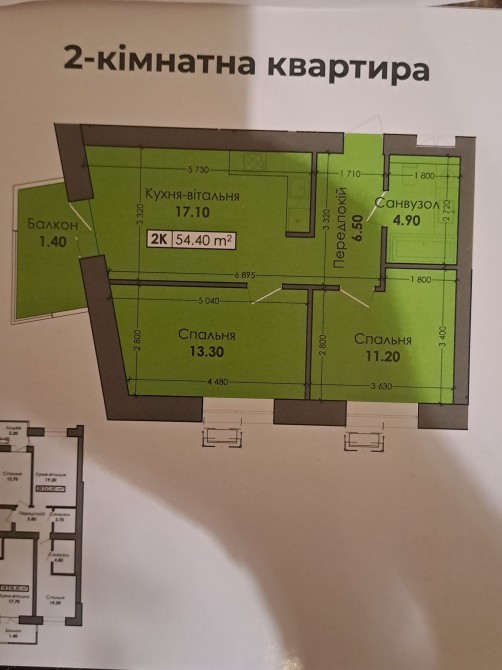 Гарне планування, заг.площа-54,4квм, спальні-13,30 квм та 11,20 квм, санвузол-4,90квм, є балкон.