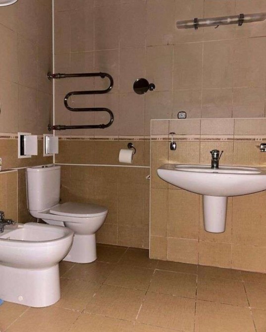 Основна ванна кімната: повнорозмірна ванна, душова зона, туалет, біде та умивальник.