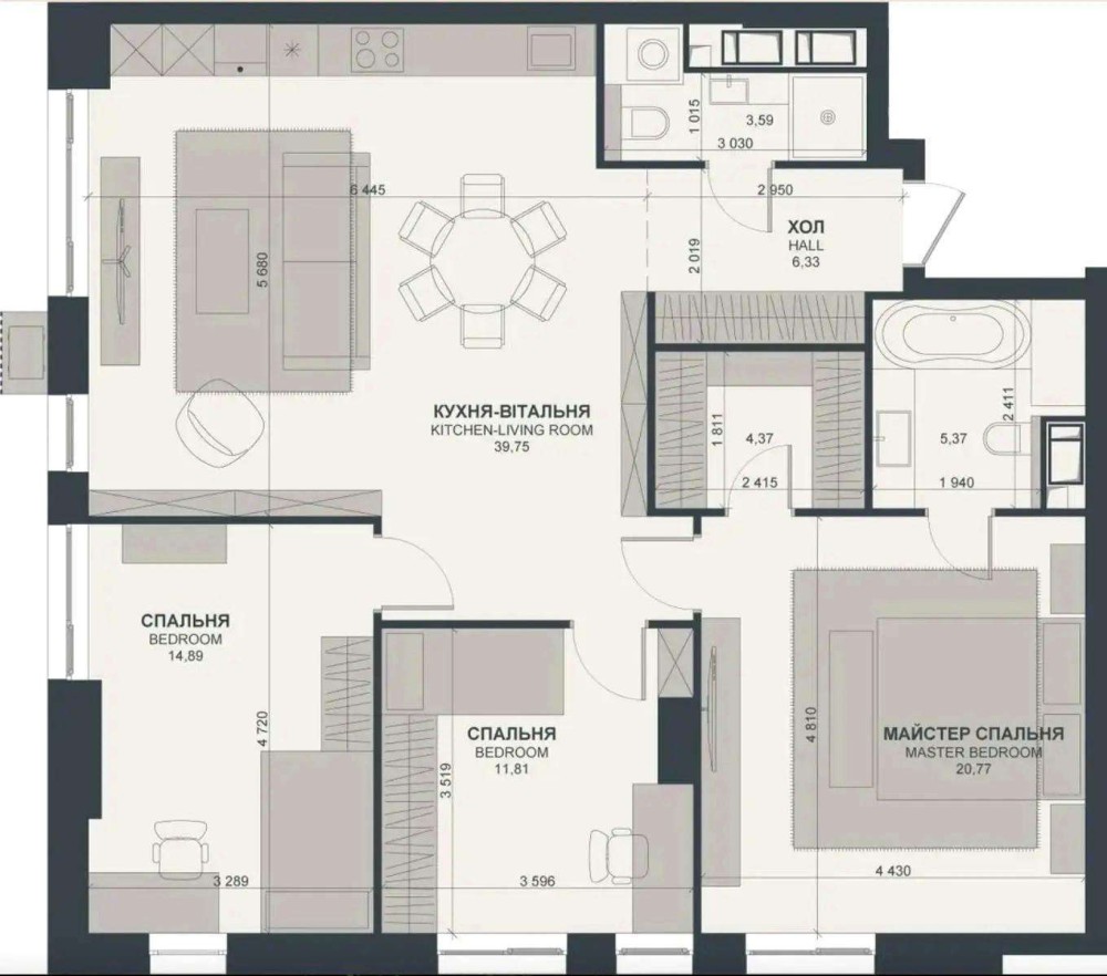 У квартирі передбачені три ізольовані спальні, окрема гардерона та мастер бедрум.