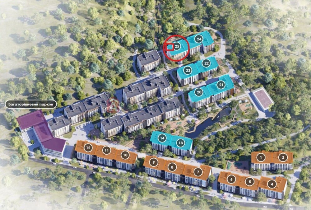 Великий житловий комплекс. В зданих секціях вже працюють магазини. На території є дитячі та спортивні майданчики, зони барбекю. На території буде озеро.