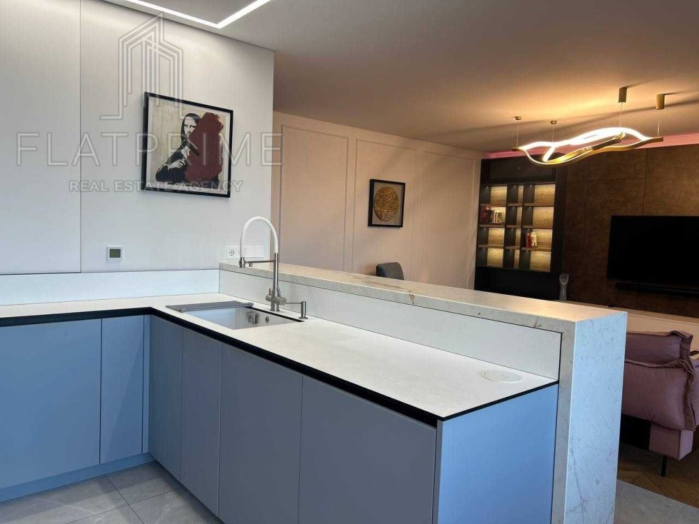 Простора кухня-вітальня майже 50 м²: Функціональна кухня з фасадами soft touch, приємних на дотик, та розсувним фартухом, який приховує побутові прилади та дрібниці. Кухня має понад 20 висувних ящиків Blum серії Legrabox з доводчиками для максимального зберігання, є інтегрований Space Tower - система вертикального зберігання з повним висуванням. Вбудована техніка Bosch (преміальна серія): посудомийна машина, духова шафа, мікрохвильова піч, індукційна варильна поверхня, холодильник із морозильною камерою, вертикальна кругла витяжка Franke. Широка барна стійка з керамограніту зі вбудованим сховищем для вина та інших напоїв. Велика вбудована 74см мийка з високим краном, що має висувну та обертальну функції для зручного використання, у тому числі з подачею питної води (зворотний осмос), та вбудованим подрібнювачем відходів InSinkErator.