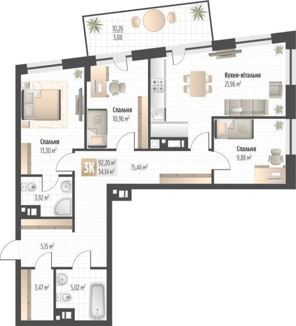 • Загальна площа 92.2 м2