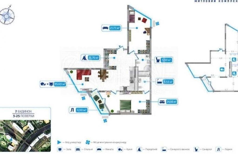 - дві спальні (21.7 м2 та 24.7 м2)