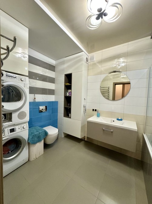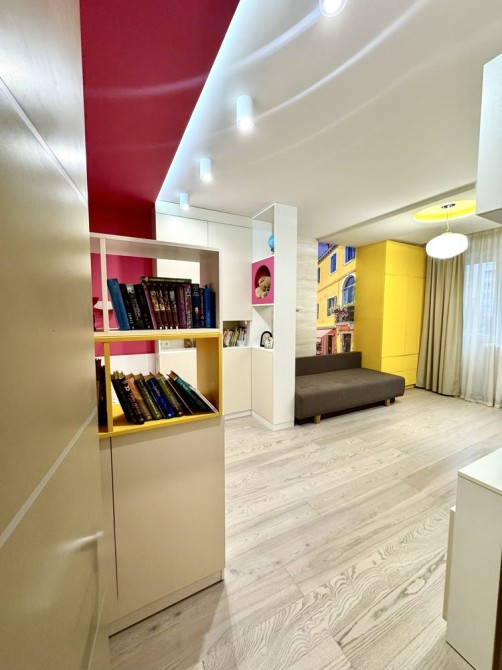 Квартира з дизайнерським ремонтом у спокійних пастельних тонах з яскравими акцентами.