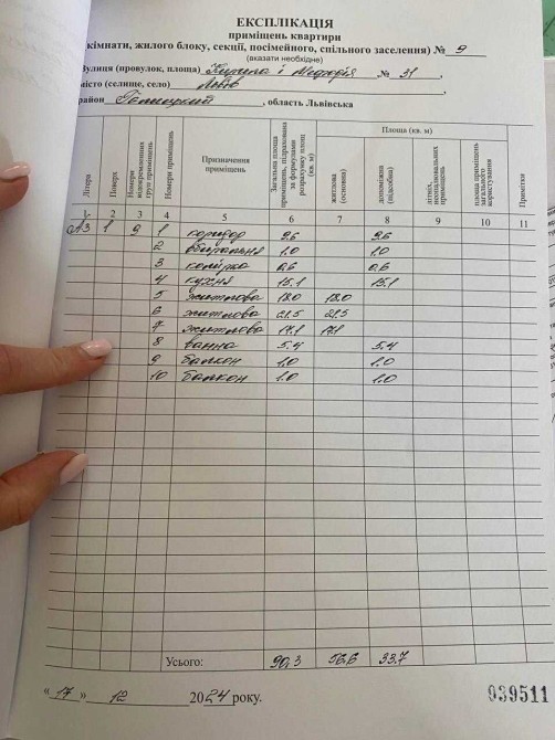 Загальна площа — 90.3 м², кухня 15.1 м², 2 балкони, 2 санвузли, 3 кімнати, коридор, є кладовка на поверсі.