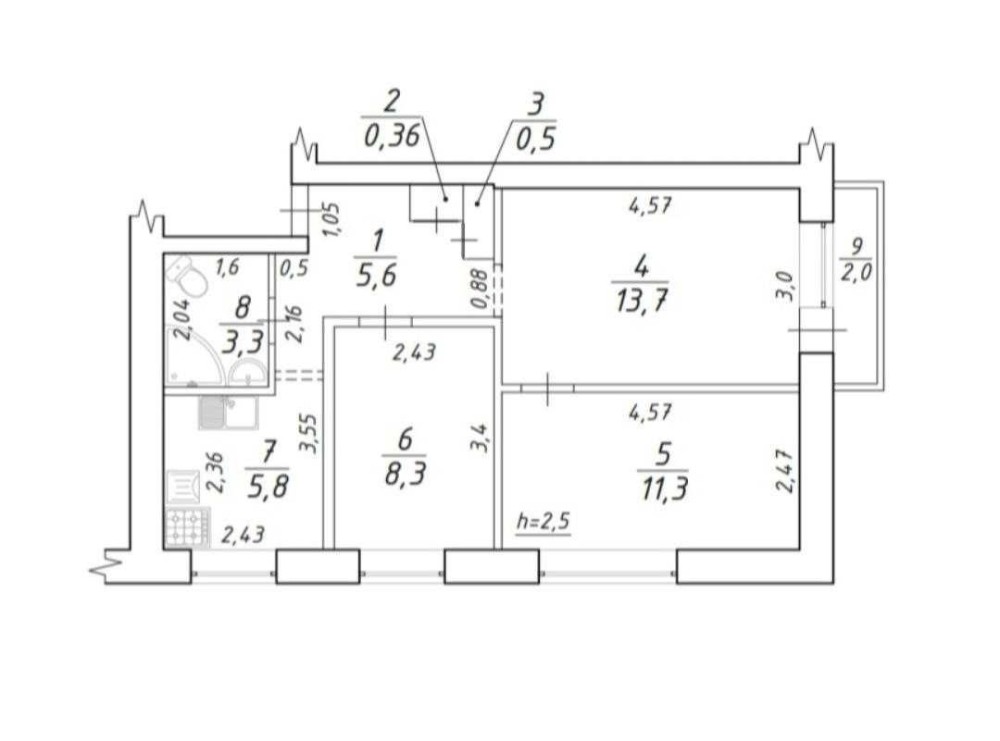 • Площа кухні 5.8 м2
