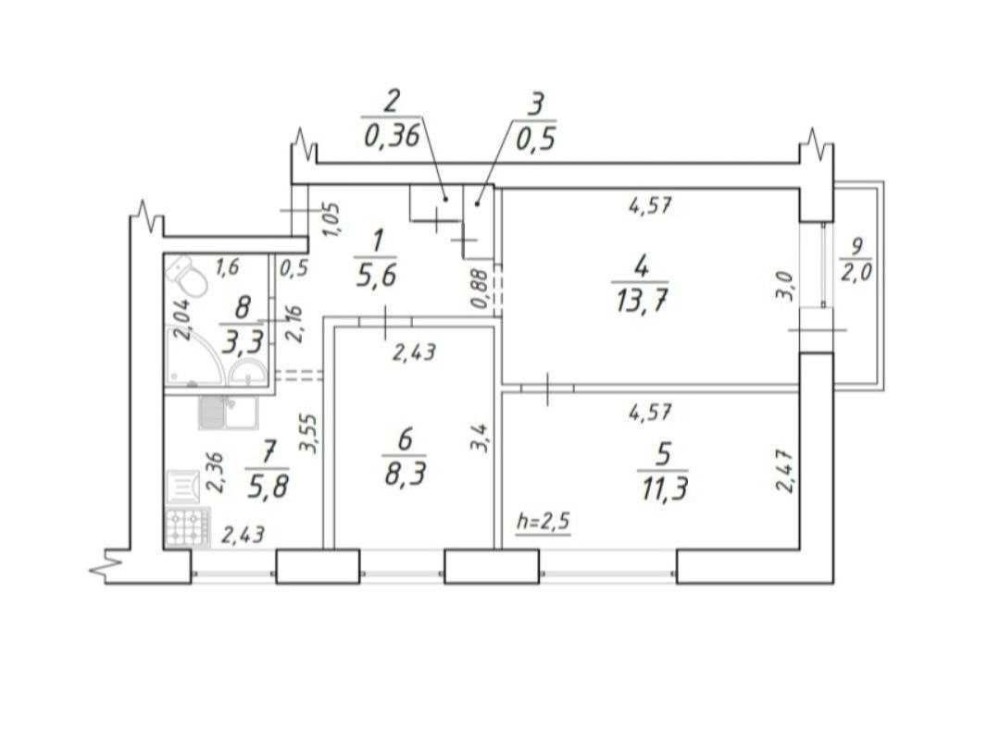 Площа: 50 м²/33,3 м²/5,8 м²