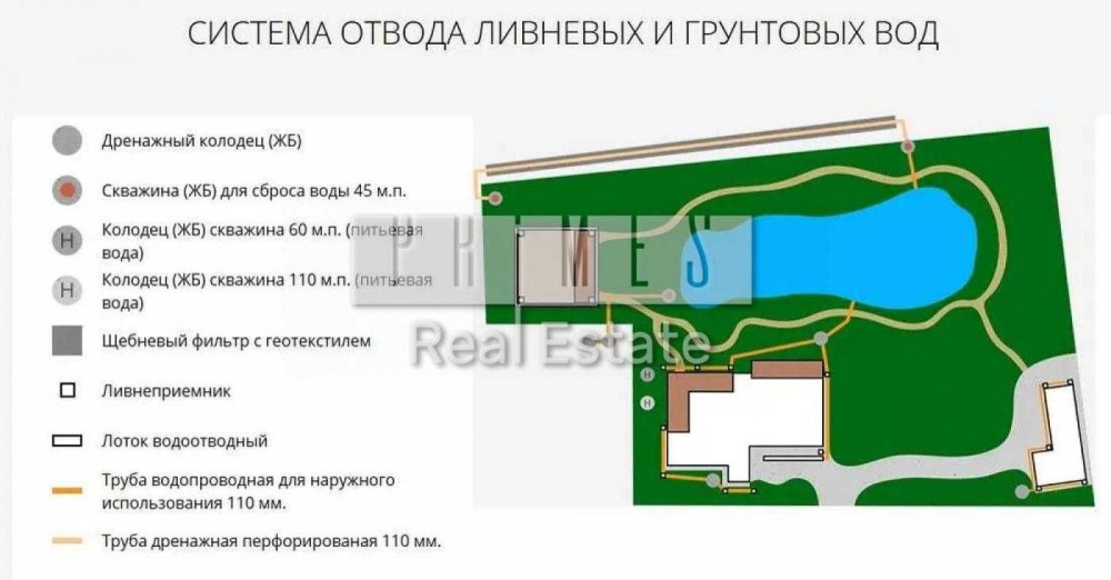 На ділянці розташоване штучне озеро площею 1200 кв.м. з фонтаном та глибиною від 1, 8 до 2, 3 метри.