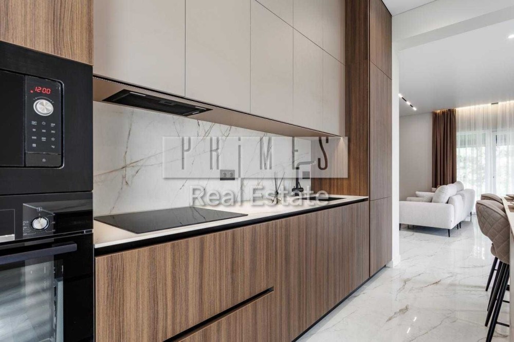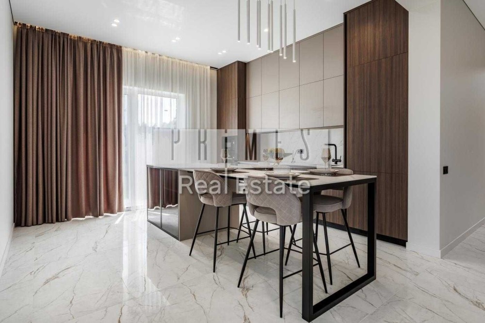 Кухня та острів виконані із міцного ударостійкого матеріалу, фурнітура Блюм (Австрія).