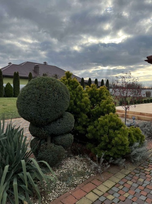 До будинку дві земельні ділянки правильної та рівної форми 16 сотин. Ландшафтний дизайн з багаторічними декоративними насадженнями , сад, виноград. Є сарай. Двір викладений бруківкою , доглянутий газон. Три заїзди на автоматичних воротах , паркан по периметру.