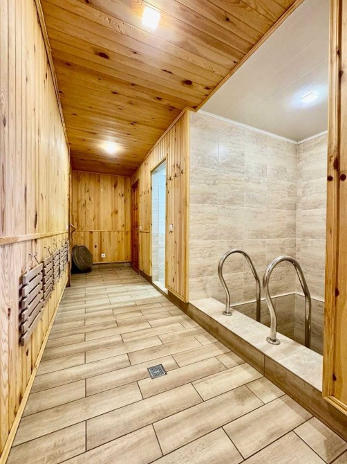 Планування: коридор, комірка, зал, парильна кімната (лазня), 2 душові, санвузол. Є кочегарна кімната.