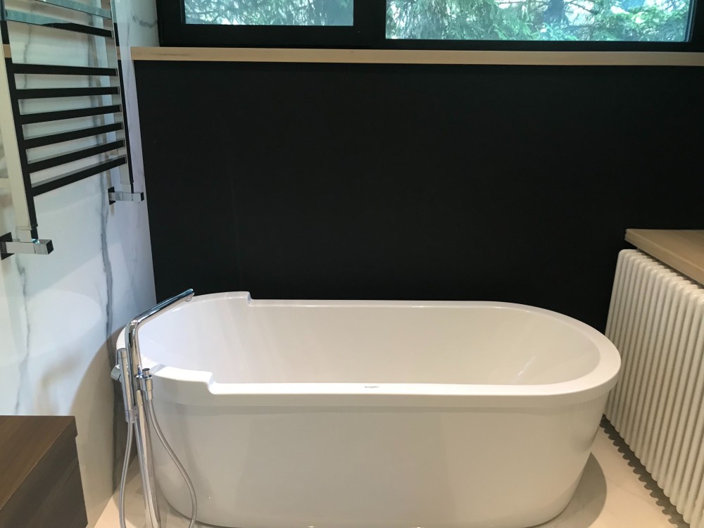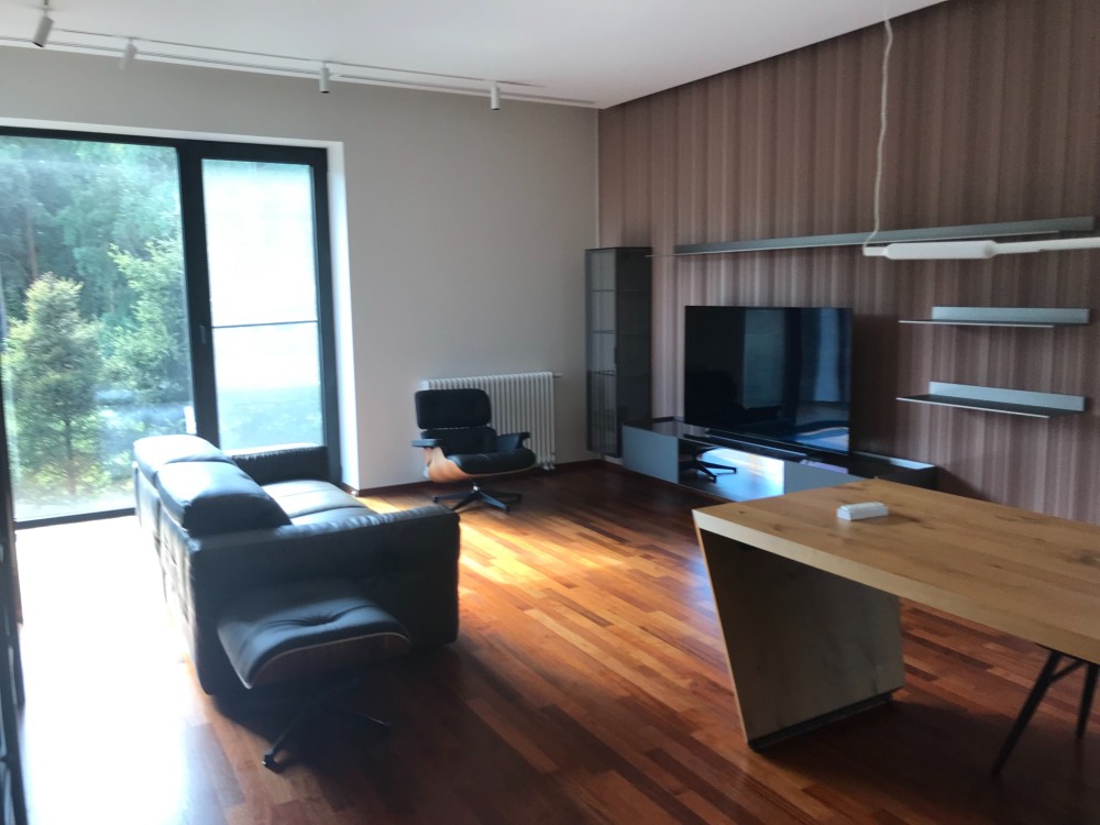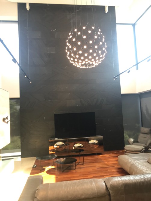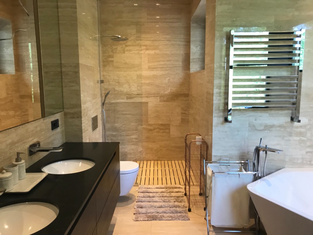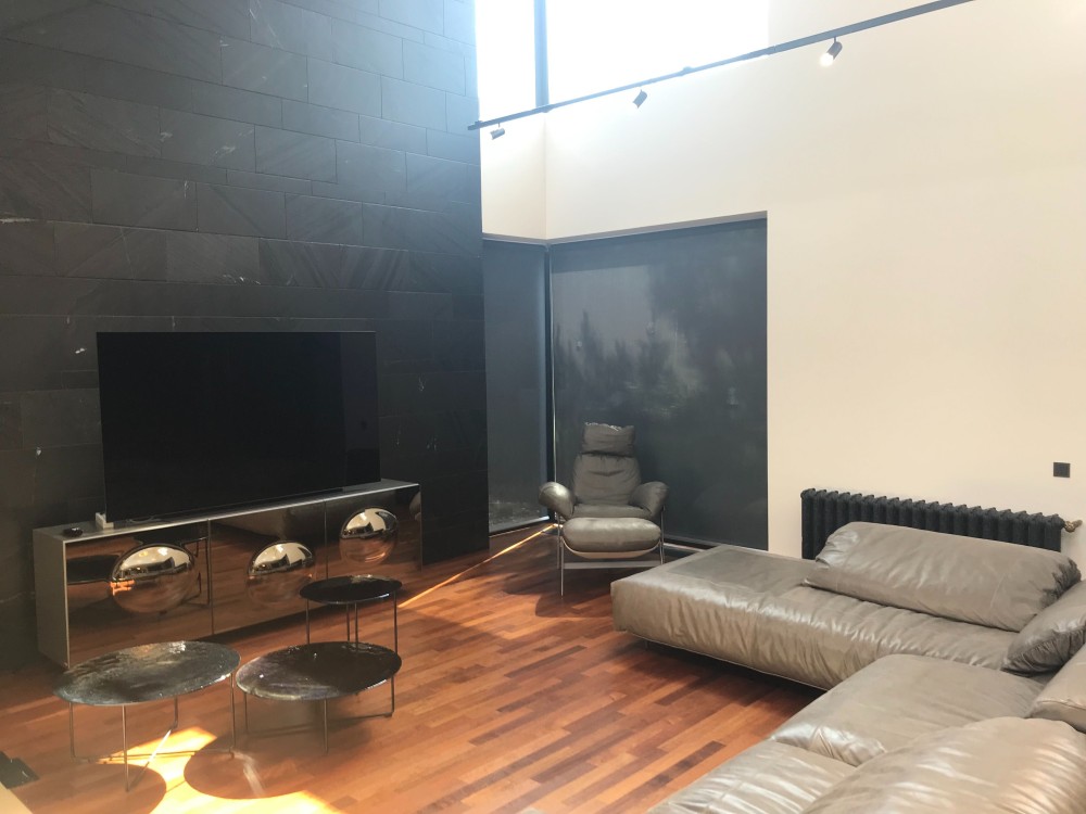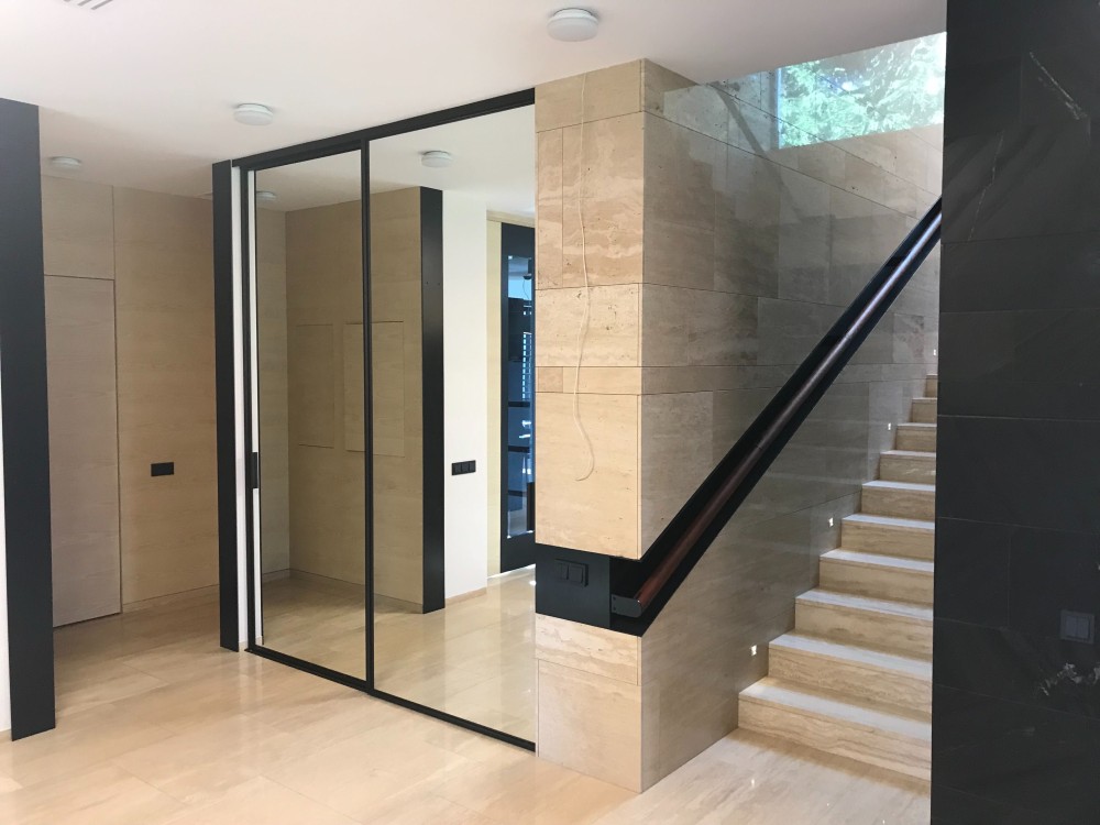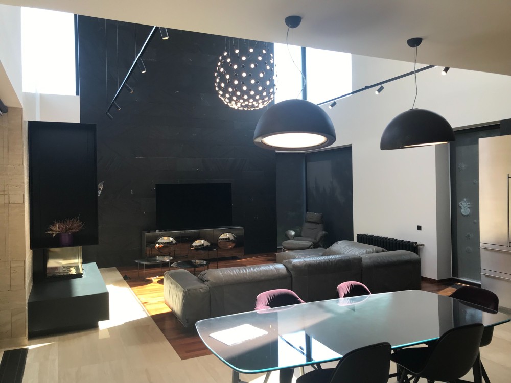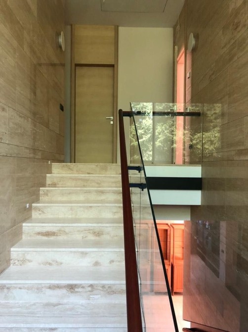 Оздоблення стін – травертин, індійський чорний сланець, підлога – паркет мербау/травертин. Підлога в житлових кімнатах – паркет мербау (Boen, Норвегія).