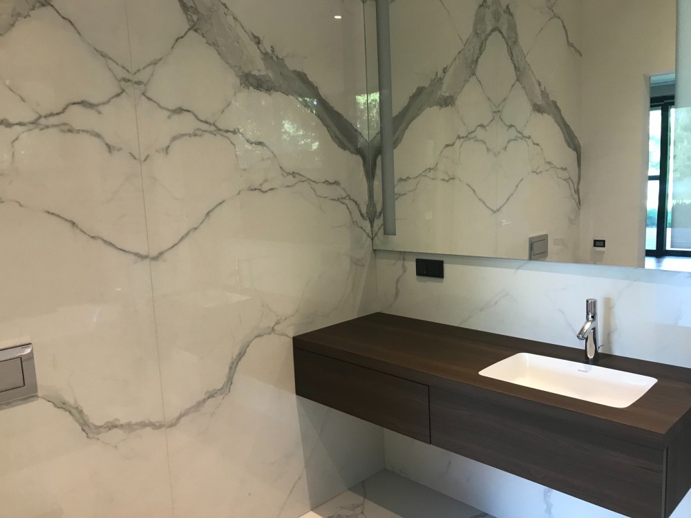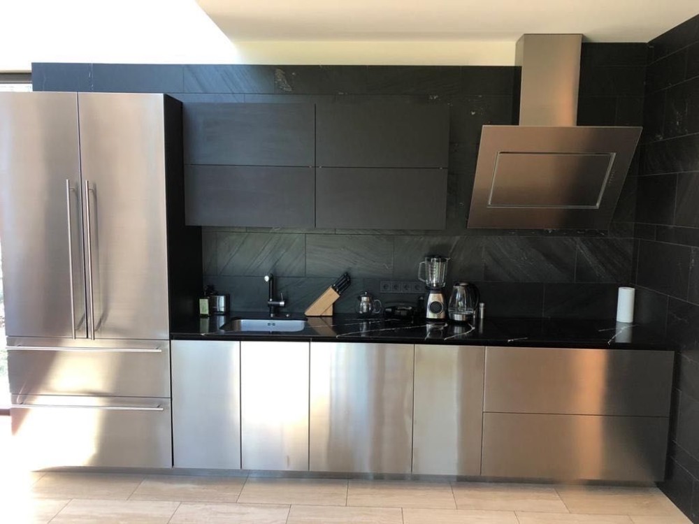 Кухонні меблі – фасади з нержавіючої сталі, техніка Liebher, льодогенератор, холодильник для вина, робоча поверхня – кварцит Caesarstone. Сантехнічні пристрої виробництва Італія, Німеччина.