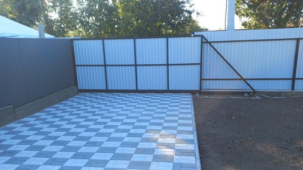 рівна ділянка засипана чорноземом, залиті бетонні доріжки, покладена тротуарна плитка, паркан по периметру, встановлені відкатні ворота, передбачене місце для авто.
