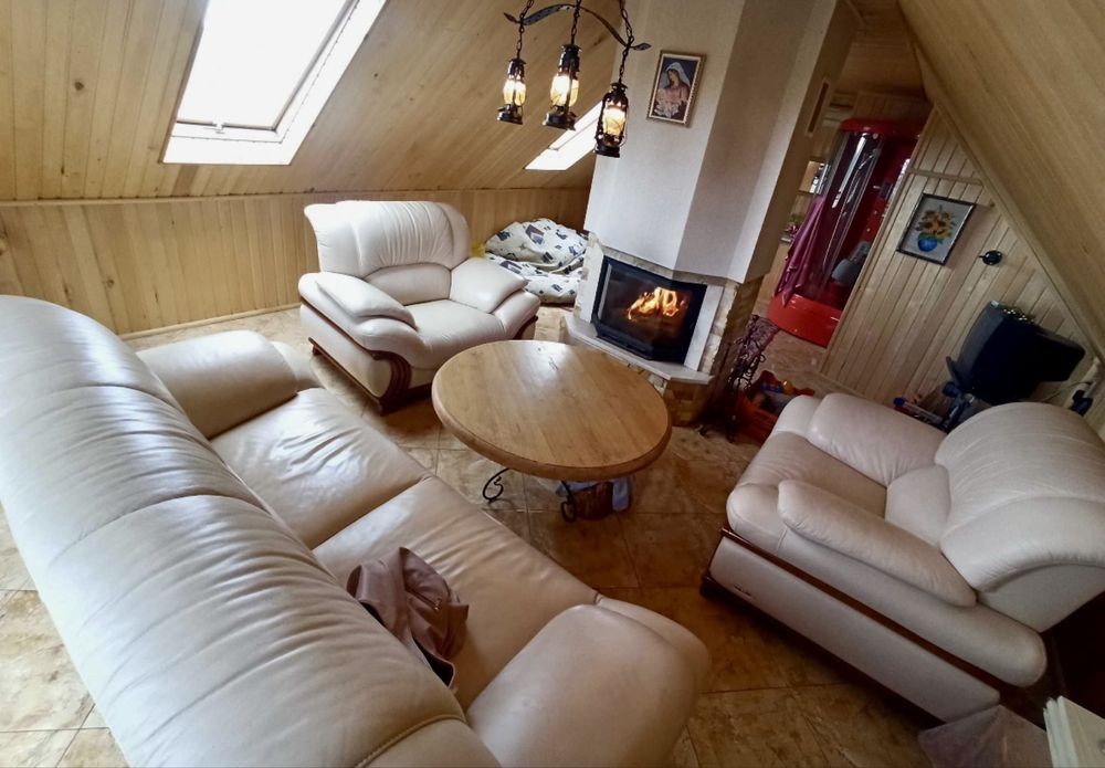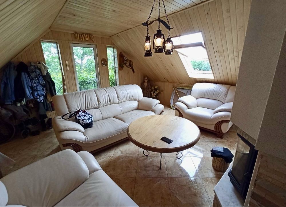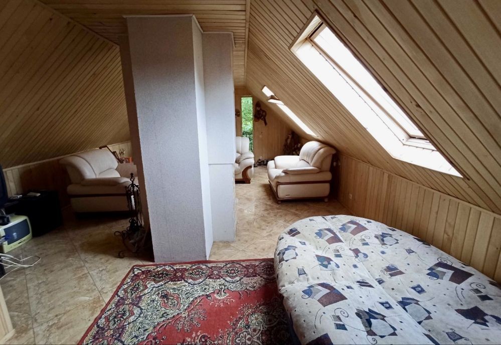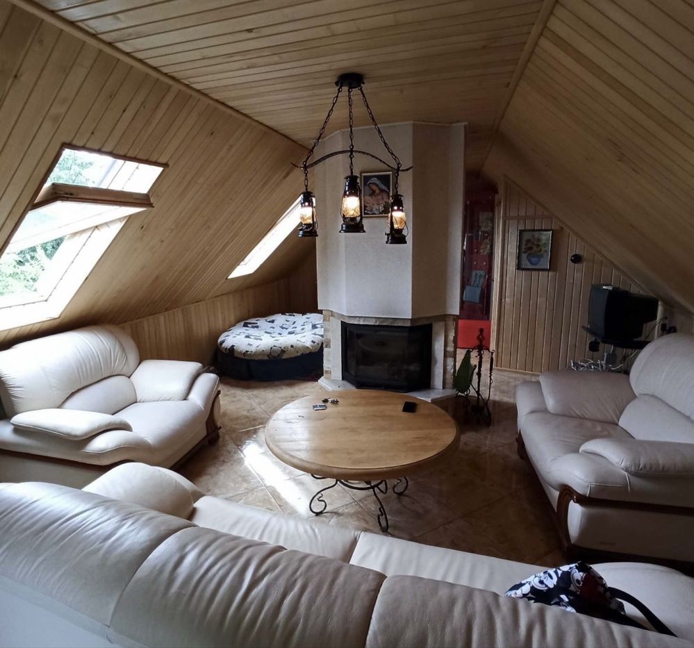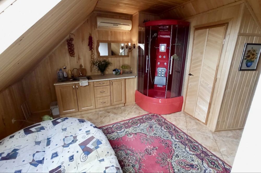 - На 2-му поверсі суцільна массандра зала 46м2 зонована каміном. Є кухонька, мягка частина, душова і окремий санвузол.