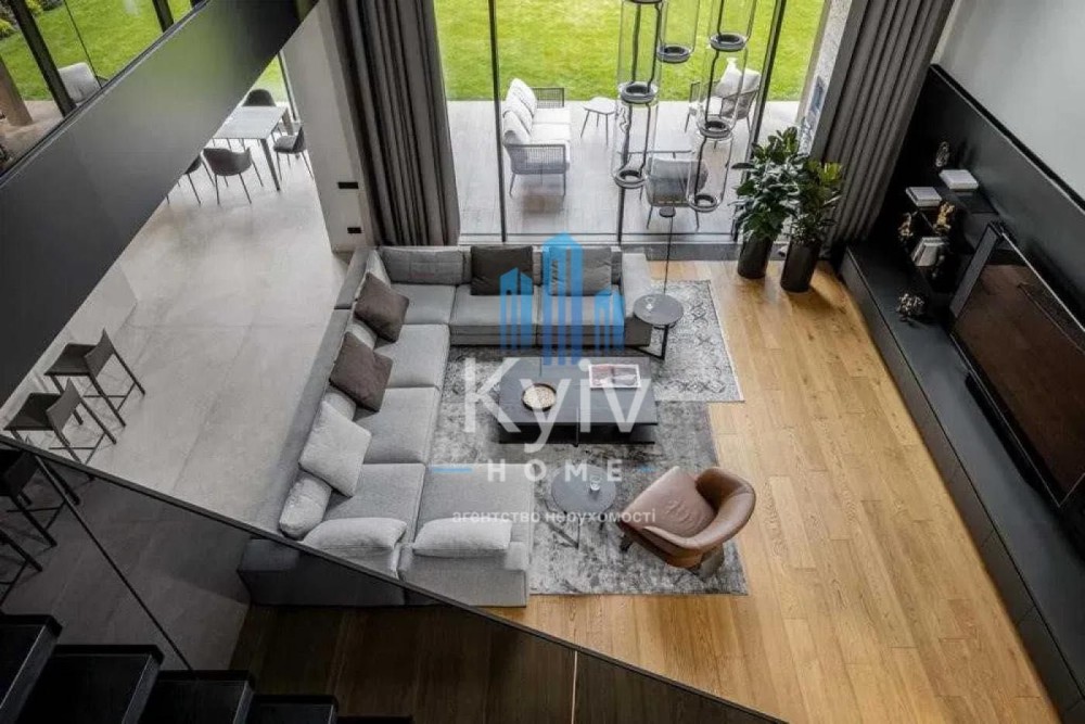 Будинок з двома терасами, з каміном та дизайн інтер'єру в сучасному стилі, тільки з натуральних матеріалів. Панорамні вікна та багато сміливих рішень в інтер'єрі. Кухня з гігантським островом із керамограніту, підрізаним під кутом 45 градусів. Меблі із захисним покриттям від відбитків пальців. Техніка Miele, лише посудомийна машина Bosch.