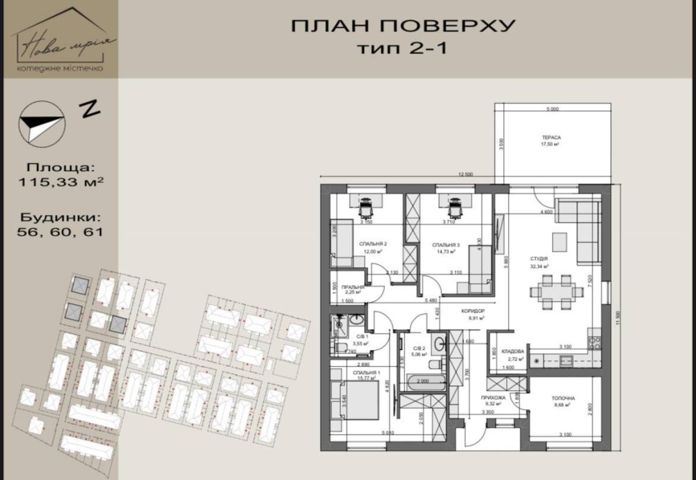 Площа будинку: 115 м²
