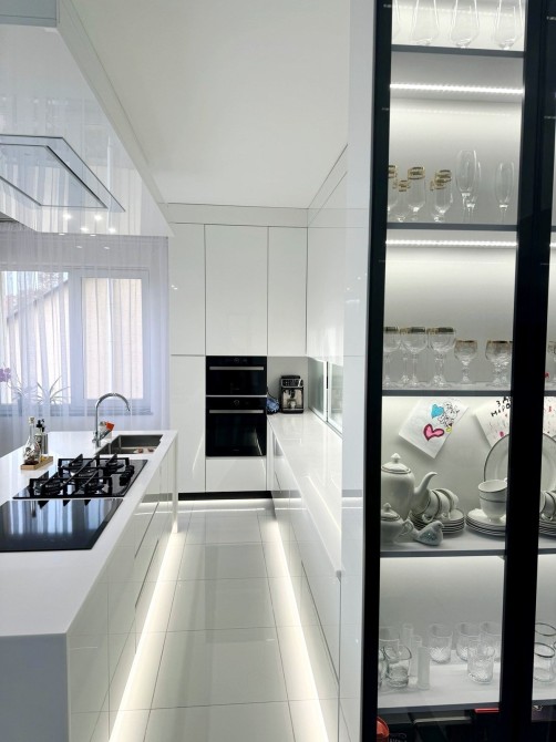 Перший поверх - простора кухня з новою сучасною технікою, їдальня має чудовий стіл з мармуровою стільницією, вітальня, санвузол, гардероб, заплановано винну шафу.