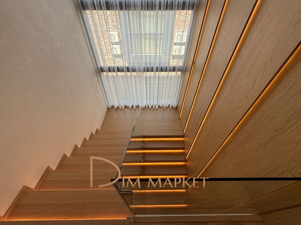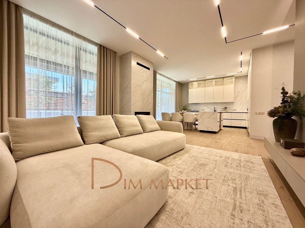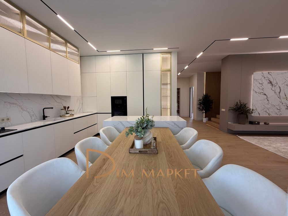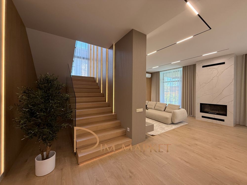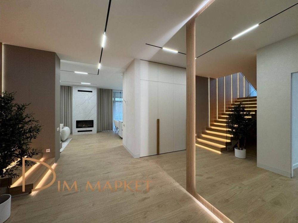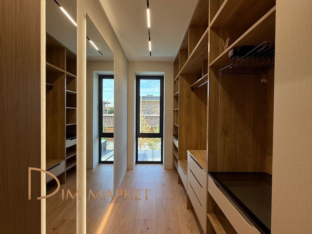Має 5 кімнатне планування, простору кухню вітальню з виходом на криту терасу, 3 санвузли, декілька гардеробних, котельню, пральню