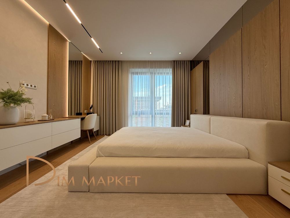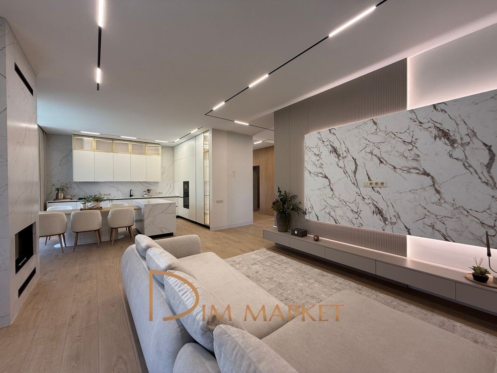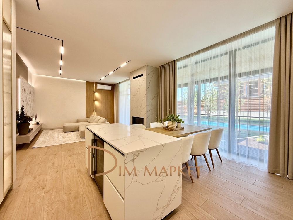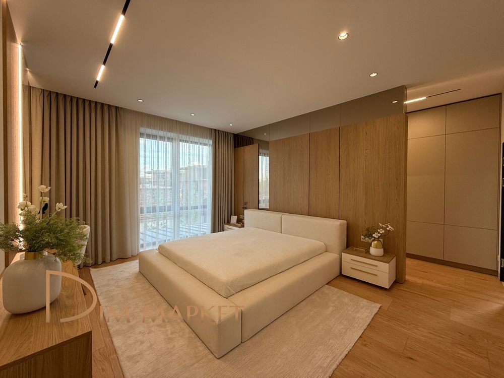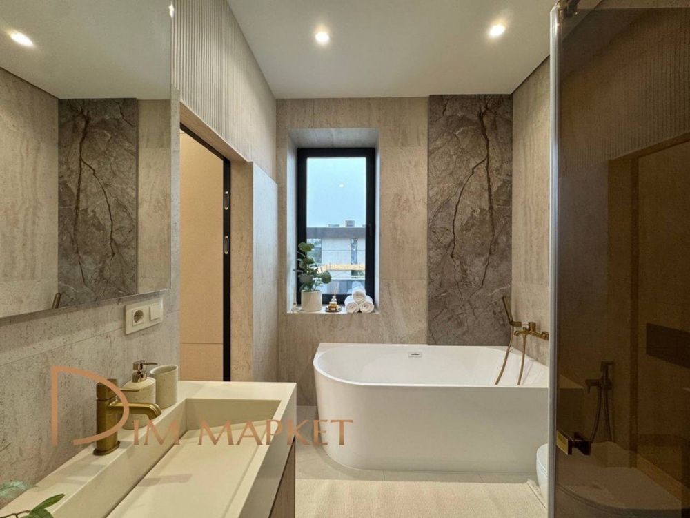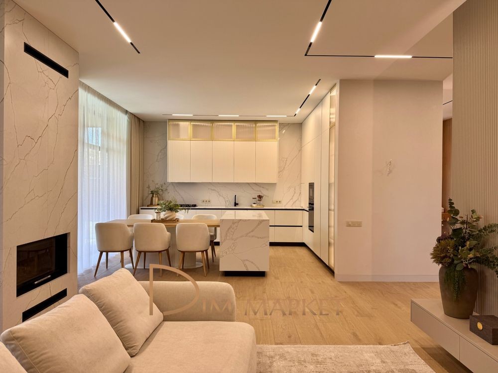 Має 5 кімнатне планування, простору кухню вітальню з виходом на криту терасу, 3 санвузли, декілька гардеробних, котельню, пральню