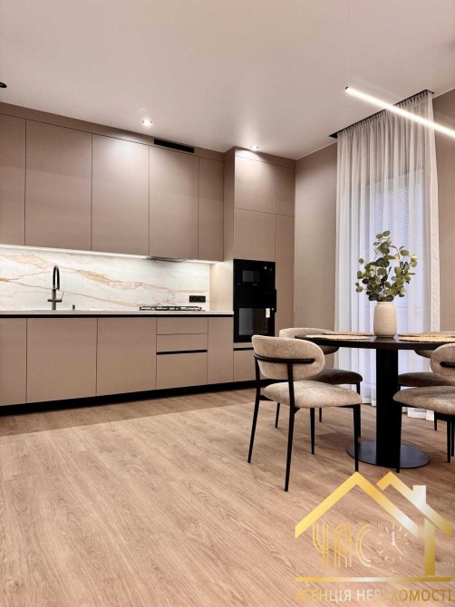 Велика простора кухня-вітальня — серце будинку. Вона облаштована диваном, сучасною кухнею та вбудованою технікою: газова варильна поверхня, духова шафа, вмонтований холодильник, посудомийна машина. На підлозі якісний кварцвініл, у всіх необхідних зонах — тепла підлога.