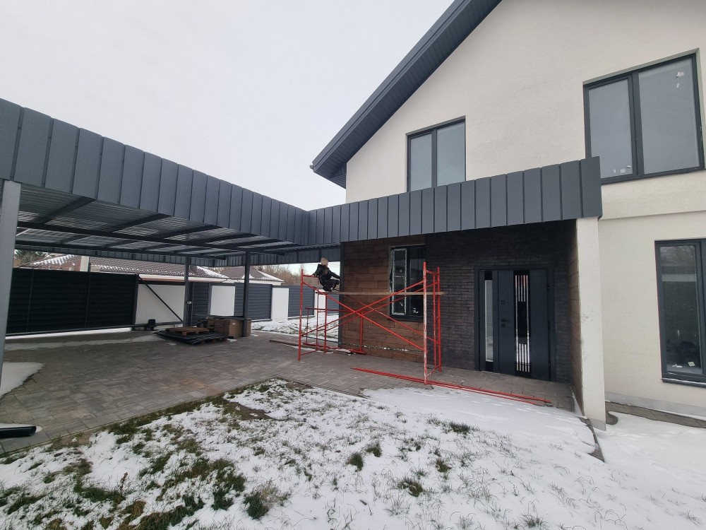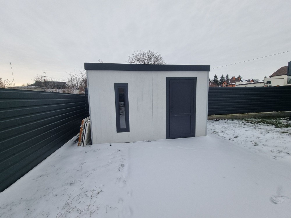 АвтоНавіс 8х9 метрів поєднаний з відкатними воротами для компактного розташування та використання території. Унікальний оцинкований садовий будинок 2х4