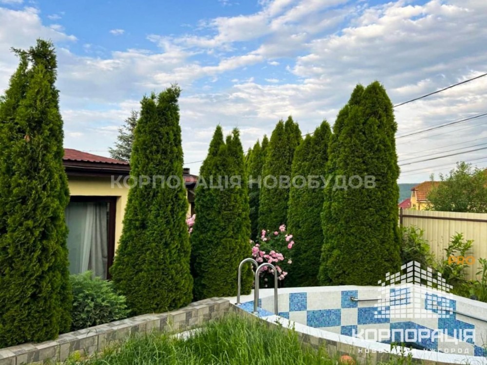 Особливу увагу заслуговує двір: зелена доглянута територія площею 4 сотки, вічнозелені насадження, затишні куточки для відпочинку, власний басейн, зона барбекю з мангалом, накритий паркувальний навіс для авто. І все це – в оточенні природи, адже поруч розкинувся ліс, що дарує свіже повітря і неймовірну атмосферу спокою.