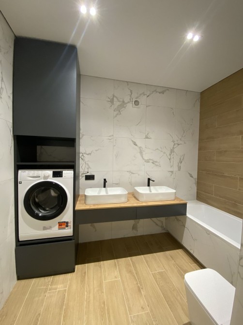 ванні кімнати з меблями, інсталяціями та пральною машиною.