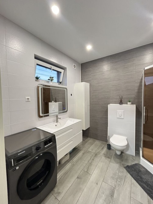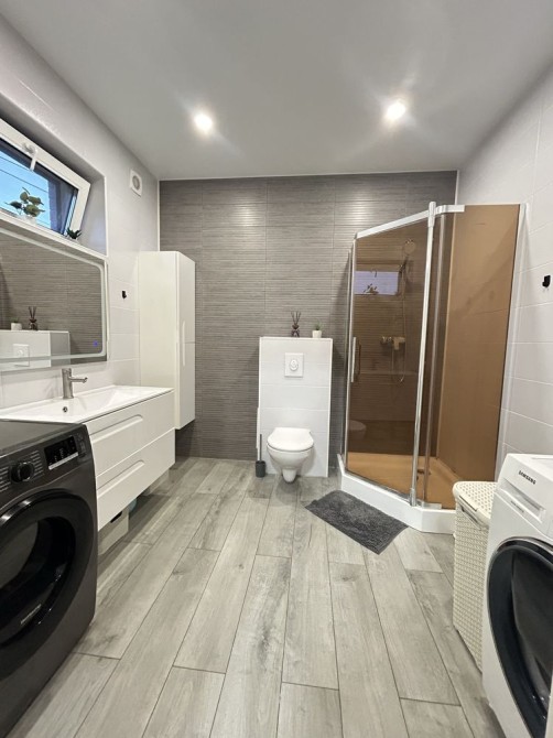 Просторий санвузол з якісною сантехнікою, пральною та сушильною машинами.