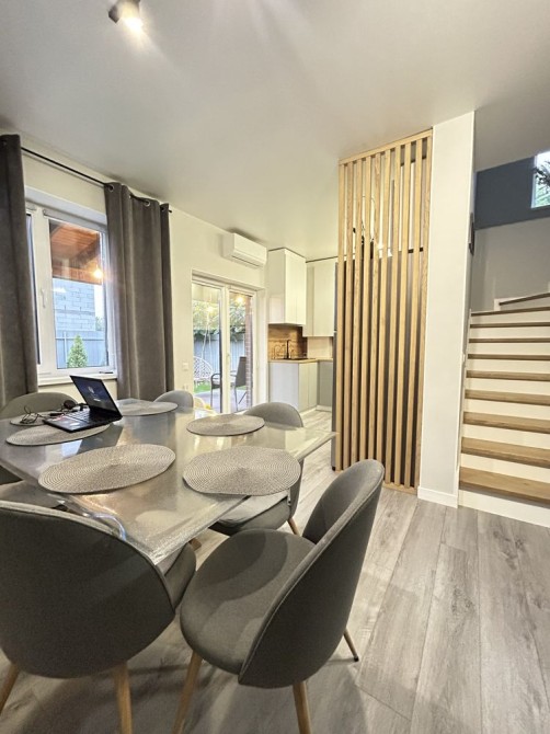 Пропонується до продажу сучасний дуплекс у тихій, зеленій локації м. Гостомель. Будинок розташований у приватному секторі серед нової забудови. Поруч зупинка транспорту, зручний асфальтований під’їзд. До озера з набережною, пляжем та альтанками — лише 7 хвилин пішки.