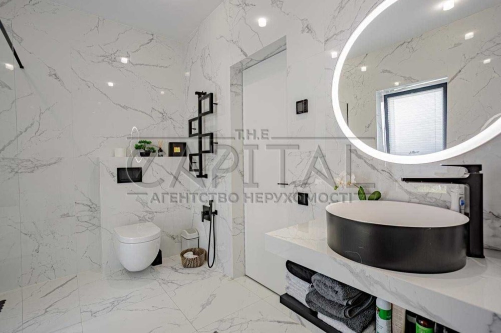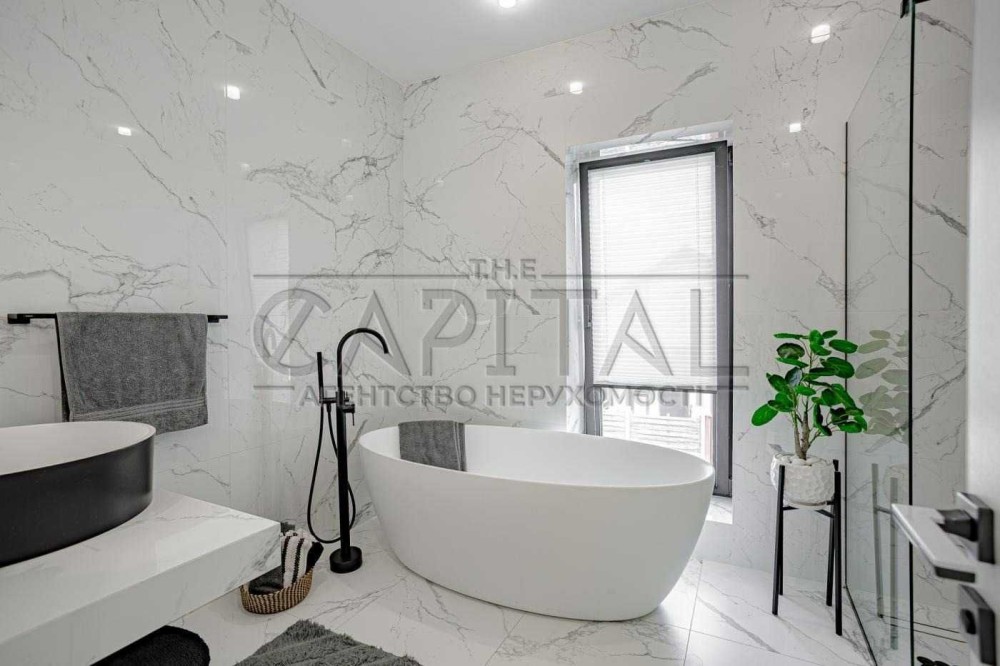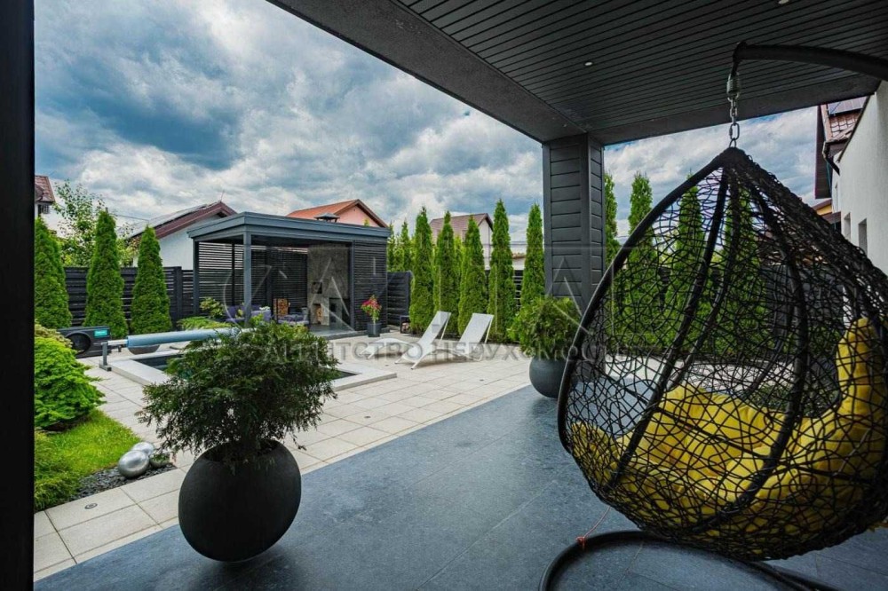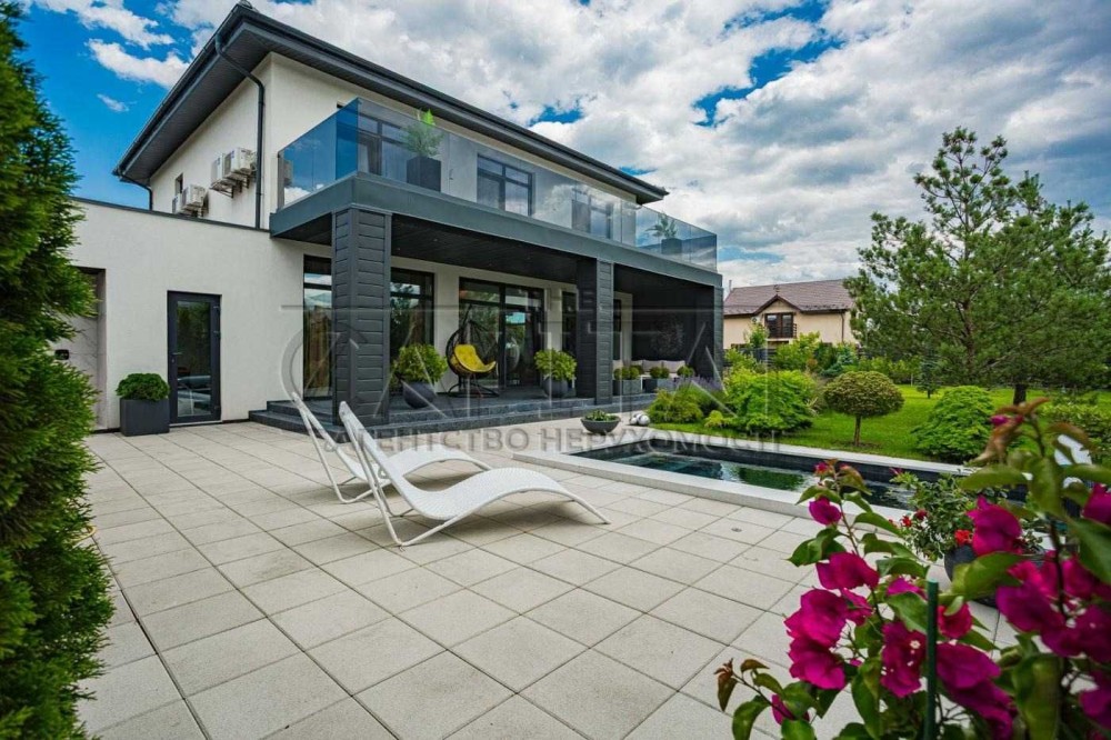 Загальна площа будинку становить 165 м2, площа ділянки - 9 соток. Він вирізняється гарним дизайнерським ремонтом і просторими терасами, басейном та багатим ландшафтом.