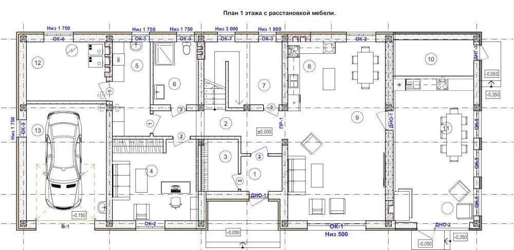 1 поверх: кухня-вітальня, кімната, санвузол, гардероб, веранда, пральня, котельна, кладова, гараж, вулична кладова.