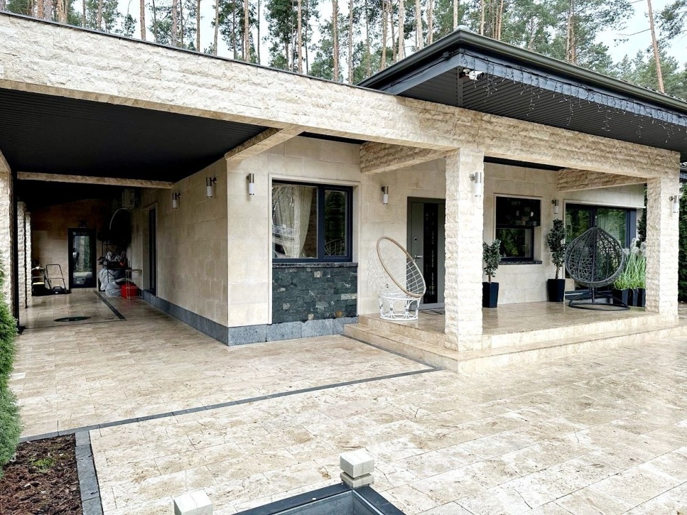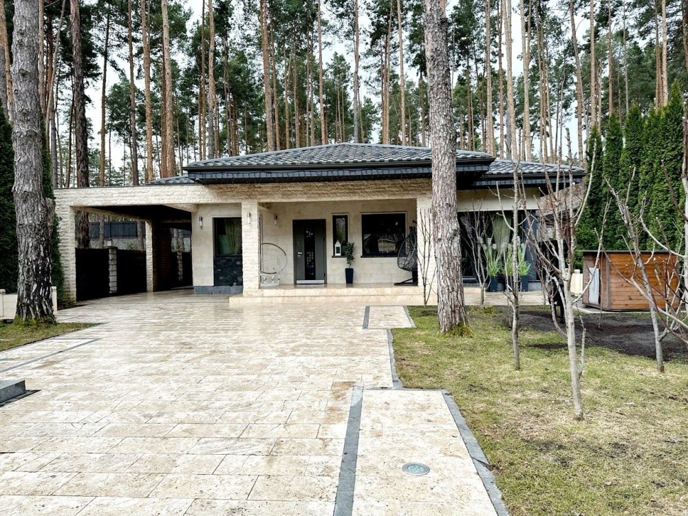 Одноэтажный дом кирпичный,облицовка натуральный камень плитка дикого ракушняка, большие окна делают дом светлым и с прекрасным видом на зеленую зону: 4спальни, огромная гардеробная,2су,прачешная,кухня с зоной отдыха,высота потолков 3,5м что делает дом просторным ..Отдельный вход в кабинет мастерскую со двора,парковка на 2 автомобиля.