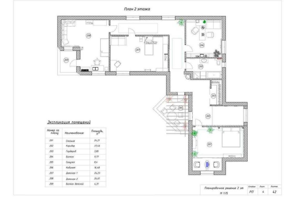 - На другому поверсі розміщені кімнати: Спальня; Дитяча кімната для двох підлітків; Дитяча кімната для одного підлітка з балконом; Кабінет; Гардероб; Санвузол; Балкон